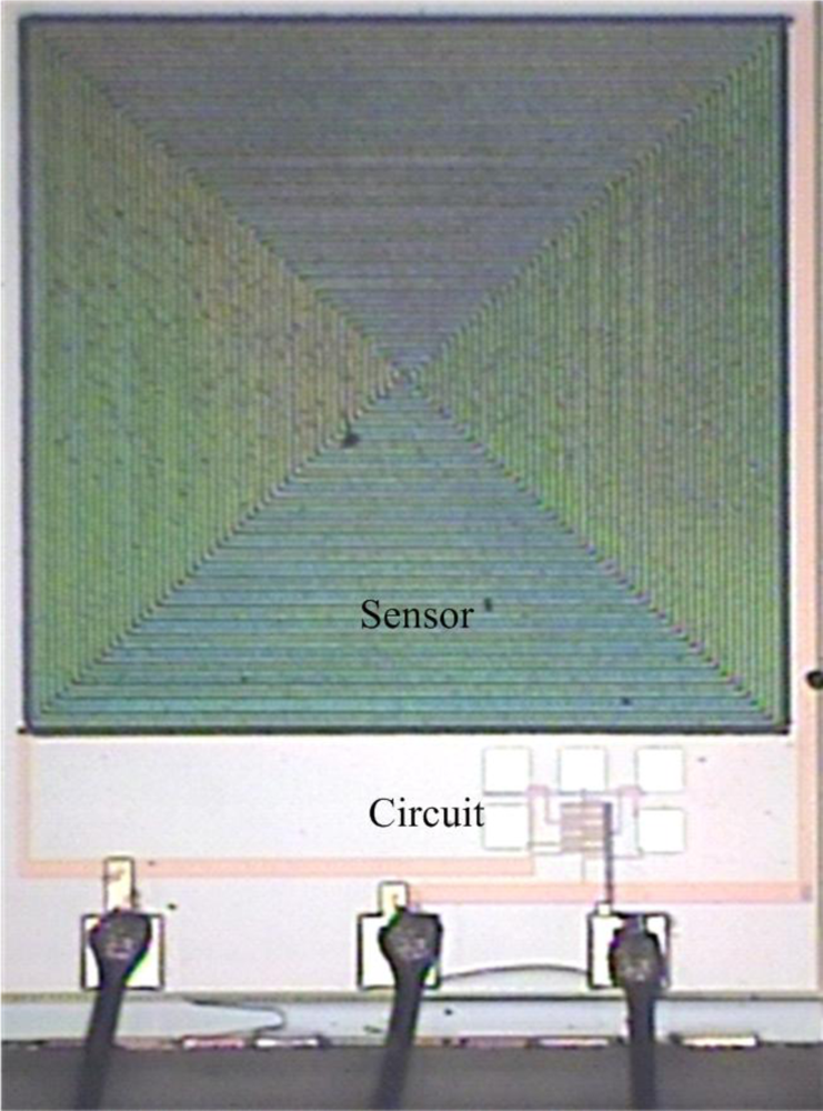 Figure 5(a) presents the integrated humidity sensor after completion of the CMOS process. In the humidity sensor, the silicon dioxides are adopted as the sacrificial layer, and the metal layers are used as the sensing capacitor. The sacrificial layer must be removed. Figure 5(b) shows that the chip is immersed in Silox to etch the silicon dioxide, and to obtain the gaps of interdigital electrodes in the sensing capacitor.