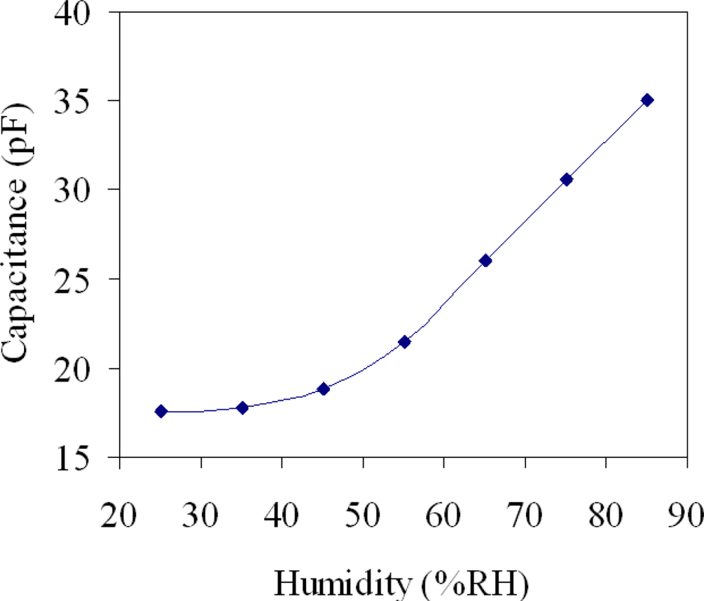 Humidity sensors that are used to measure and monitor environmental humidity are important devices in many industrial and biomedical fields. The micro electromechanical system (MEMS) technique has become popular for the miniaturization of sensors. Humidity sensors fabricated by the MEMS technique have the advantages of small size, high performance, easy mass-production and low cost [1]. Several studies have recently used the MEMS technique to manufacture micro humidity sensors. For instance, Lee et al. [2] presented a polyimide humidity sensor with a micro-bridge structure created using front-side etching with XeF2 gas. The humidity sensor was a capacitive type, and the polyimide was locally cured at a temperature over 350 °C for 1 hour by the MEMS micro hotplate. The humidity sensor exhibited a sensitivity of 0.77 pF/%RH and a hysteresis of 0.61 %RH. Miyoshi et al. [3] utilized the soft-MEMS technique to manufacture a flexible humidity sensor. The humidity sensor was a sandwich structure with a hydrophilic poly-tetrafluoroethylene membrane located between two gold deposited layers. A resistive humidity sensor proposed by Li et al. [4] was fabricated using the multi-user MEMS process. The sensing material of the humidity sensor was the organic conductive polymer—poly(3,4-ethylenedioxythiophene)—that was prepared by electrochemical deposition, and filled in a narrow air gap between two nickel electrodes. The resistance of the sensor changed from 37 to 62 Ω when the relative humidity varied from 22 to 99.9 %RH at room temperature. Juhász et al. [5] developed two capacitive humidity sensors using a semiconductor process and anodic oxidation. The sensing layer of the sensors, which was porous alumina, was produced by electrochemical oxidation of aluminum thin film under anodic bias. One sensor had a vapor-permeable palladium upper electrode, and the other had an electroplated gold-grid electrode. The highest sensitivity of the sensors was about 15 pF/%RH. Chen et al. [6] used the MEMS technique to construct a resistive humidity sensor, which its structure contained a freestanding cantilever. The cantilever was a composite structure comprising a layer of platinum deposited on a silicon nitride layer and then covered with a polyimide sensing layer. When the polyimide sensing layer absorbed vapor, the cantilever produced a deflection, leading to the platinum layer generated a change in resistance. These humidity sensors [2–6] did not have integrated circuits-on-a-chip, so they required coupling with circuits by packaging, resulting in an increase in package cost. Integrating humidity sensors with circuits on chip helps to enhance the performance and reduce the packaging cost. Therefore, in this work a humidity sensor integrated with a ring oscillator circuit on chip is developed.