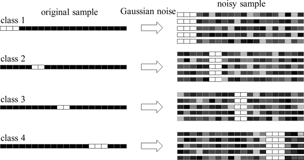 To show the effectiveness of the proposed data refining method, a toy example is presented. Let us consider a set of 20 vector samples (∈ ℝ20) whose input variables are either 255 or 0. In Figure 3, these variables are represented as white and black pixels, respectively. Each sample belongs to one of four classes, and its class can be identified by the position of the white pixels. The number of white pixels is 3, 2, 2 or 3 depending on the class. We add Gaussian random noise with standard deviation of 15 to each sample so that the peak signal to noise ratio (PSNR) of a sample is 24 ∼ 29 dB (see Figure 3). It is obvious that the input variables corresponding to the white pixels (total 10 variables) have the most discriminative information because their variances in the same classes are zero, while those in the different classes are very large. We apply the proposed data refining method to this data set and observe which variables were first removed as the number of selected pixels (ns) decreases from 20 to 10. As shown in Table 2, when removing the input variables by using the proposed method, only the noisy variables corresponding to black pixels are first eliminated, while the input variables corresponding to white pixels remain. From this, we can see that the proposed data refining method is very effective in removing the input variables that have little discriminative power. Removing noisy input variables can be helpful in extracting better discriminant features. This can be observed by investigating PSNR in a sample after the variable selection. Given an original sample xo = [xo1, xo2,.., xons]T and a noisy sample xN = [xN1, xN2,.., xNns]T, the PSNR of sample xN is computed as