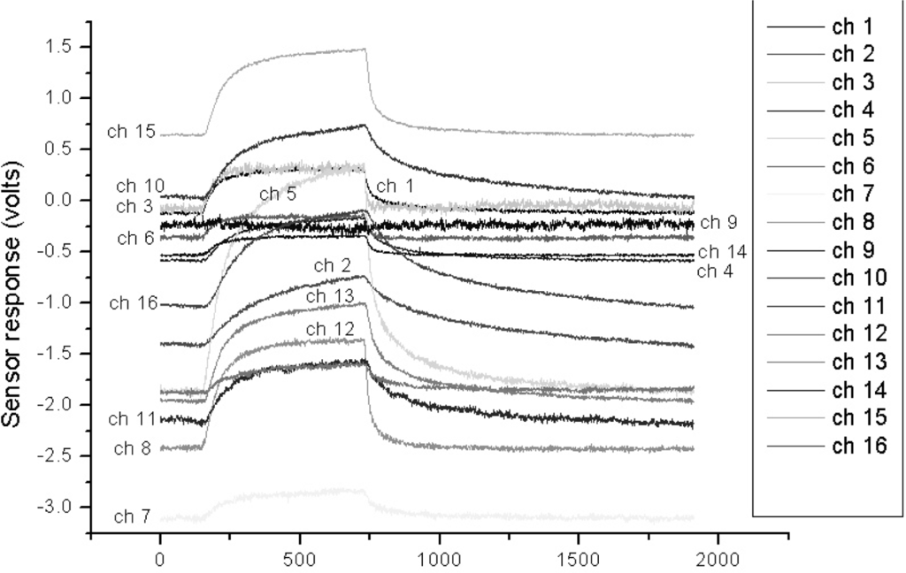 We also designed a new sensor array in order to obtain for a more efficient e-nose system involving only some channels, which turn out to be the most significant, instead of using all the channels. The channels are selected on the basis of the feature mask that is used in the data refinement. Using only the useful channels, both the classification performance and the efficiency of the e-nose system in computation and data storage are improved. In the proposed method, we require a more systematic algorithm in order to decide the optimal T and the number of the selected channels. These objectives remain as future work.
