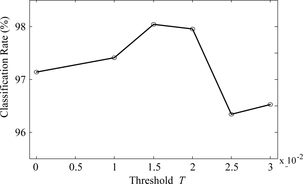 In order to evaluate and compare the performance of the proposed algorithm, we utilized the VOC measurement data set as in Section 3. Figure 5 shows one of the typical multi-sensor responses of the acetone vapor. We checked the classification rates by increasing T from 0 to 0.02 in order to find a suitable threshold T. As can be seen in Figure 6, the classification rate does not always increase as T increases, i.e., the classification rate rises as T increases up to 0.015, and then drops with further increase in T. From these results, we set the threshold values to 0.015 for all the experiments.