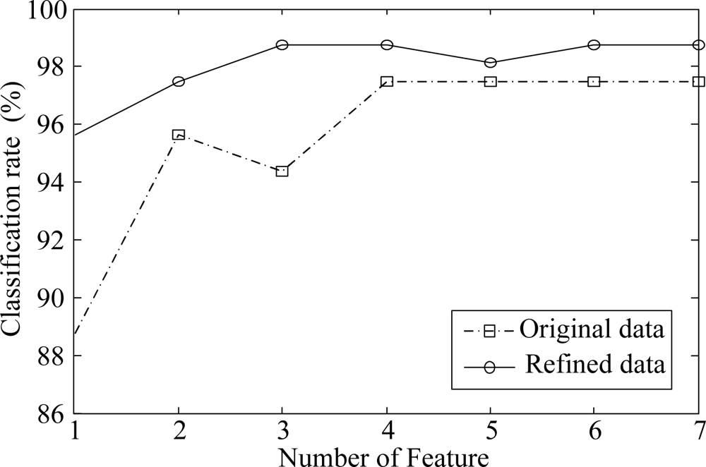 In order to evaluate the classification rates, we perform 10-fold cross validation [22] 10 times and computed the average classification rate. In this scheme, one sample from each class was randomly selected for testing, while the remaining samples were used for training. In other words, there were 152 data samples in the training set and 8 images for testing. Each input variable of data samples in the training set was also normalized using the mean, and variance of the training set. The features for classification are extracted by LDA, which is a well known method for dealing with classification problems. One nearest neighbor rule was used as a classifier and the l2 norm was used to measure the distance between two samples. Figure 8 shows the classification rates for different numbers of features. As can be seen in Figure 8, the refined data gives about 4.0% higher recognition rates on average over all the number of features than does the original data. From the Figures 7 and 8, we can see that the proposed method effectively refines the data by removing unnecessary input variables, which make it suitable for vapor classification.