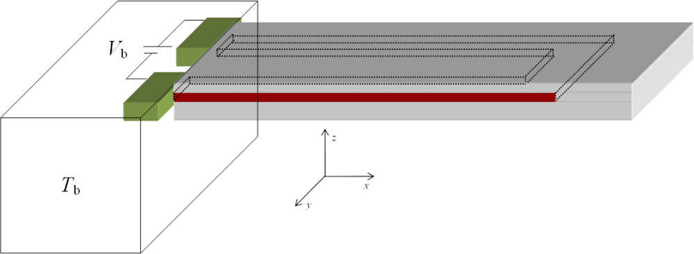 Since piezoresistive microcantilevers have slender shape and the piezoresistor is symmetric along the path of electrical current, the temperature rise due to Joule heating will remain uniform along width and thickness direction (Figure 1). The temperature profile will, however, change along the cantilever length. In other words, the heat conduction can be assumed one-dimensional. Since the value of thermal diffusivity is very high for the microcantilevers, the system will reach steady state very rapidly. Thus, the heat conduction in microcantilevers can be assumed one-dimensional and steady state case. And Equation (5) can now be combined with Equation (2) to give:
