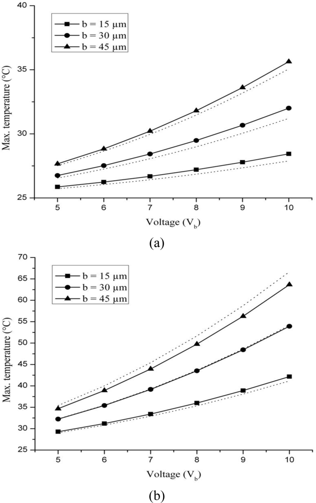 Figure 4 shows the comparison between maximum temperature results obtained from numerical analysis for silicon and silicon dioxide cantilevers having piezoresistor of widths 15, 30 and 45 μm. The results obtained from the analytical relation are also plotted for a comparison. The analytical results are shown by dotted lines. The maximum deviation between analytical and numerical results for silicon and silicon dioxide cantilever are 1.9%, 2.5% and 1.5% and 2.4%, 0.4% and 4.5%, respectively, for piezoresistor widths 15, 30 and 45 μm. It is obvious from the figure that the increase in applied voltage and width both increased the temperature. These observations agree with the predictions by Equation (9) that temperature is directly proportional to voltage and width. The width term included in defining the current carrying length, i.e., Lpzr, has no appreciable effect on temperature results.