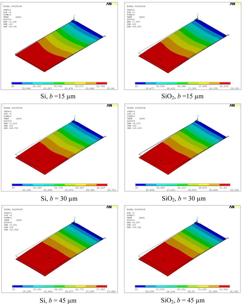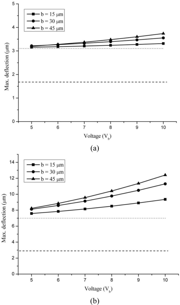 Interestingly, thermal deflections are observed in both silicon and silicon dioxide cantilevers for cases when no voltage is applied, i.e., Vb = 0. This deflection is shown by dotted lines in Figure 5. The origin of this deflection can be attributed to bimetallic effect generated due to initial temperature of the cantilever structure. In this particular analysis, the temperature of the entire structure including base and cantilever was 25 °C. The temperature combines with the CTE mismatch between constituent layers of the microcantilever to induce bimetallic effect and leads to thermal deflections. In fact, the initial temperature alone is responsible for more than 50% of total temperature in both cases. We also found that for Vb = 0, the increase in width has no significant effect on deflection, and the three deflection curves for width overlie. Thus, the base temperature should be kept low to reduce errors.