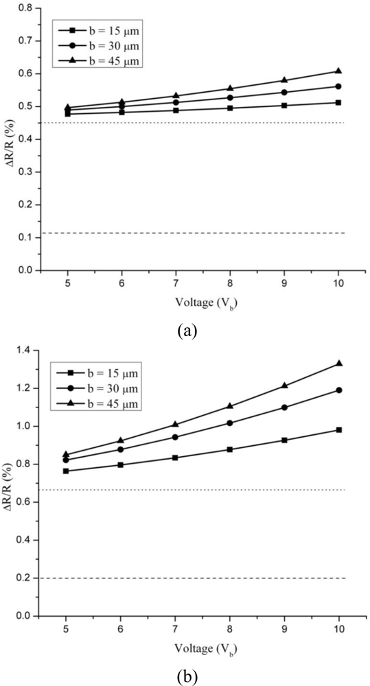 The surface stress sensitivity results for silicon and silicon dioxide cantilevers are 11.04 × 10−4 and 20.56 × 10−4, respectively. These values which are the signal are lower than those produced due to thermal effects which are the noise. This suggests a low signal-to-noise ratio (S/N) for the cantilever and that the cantilever is more sensitive to Joule heating effects than to surface stress effects. Nevertheless, the sensitivity values for deflection sensitivity are of same order of magnitude of Joule heating effects. Since low voltages produce less thermal effects, temperature rise should be controlled for optimum sensor performance. Thus, the sensitivity of the cantilever to Joule heating effects can be reduced by applying low voltages. Since low voltages also reduce the current flow which will decrease the S/N, a more practical approach is to use symmetrical Wheatstone bridge and differential read-out to eliminate Joule heating-induced thermal effects in the piezoresistive microcantilever sensor.