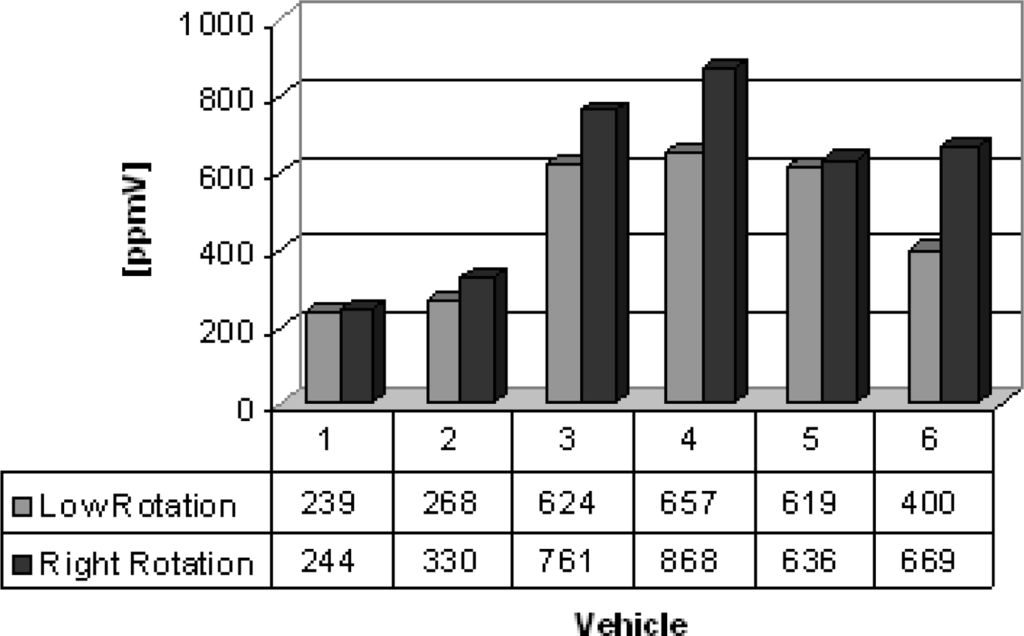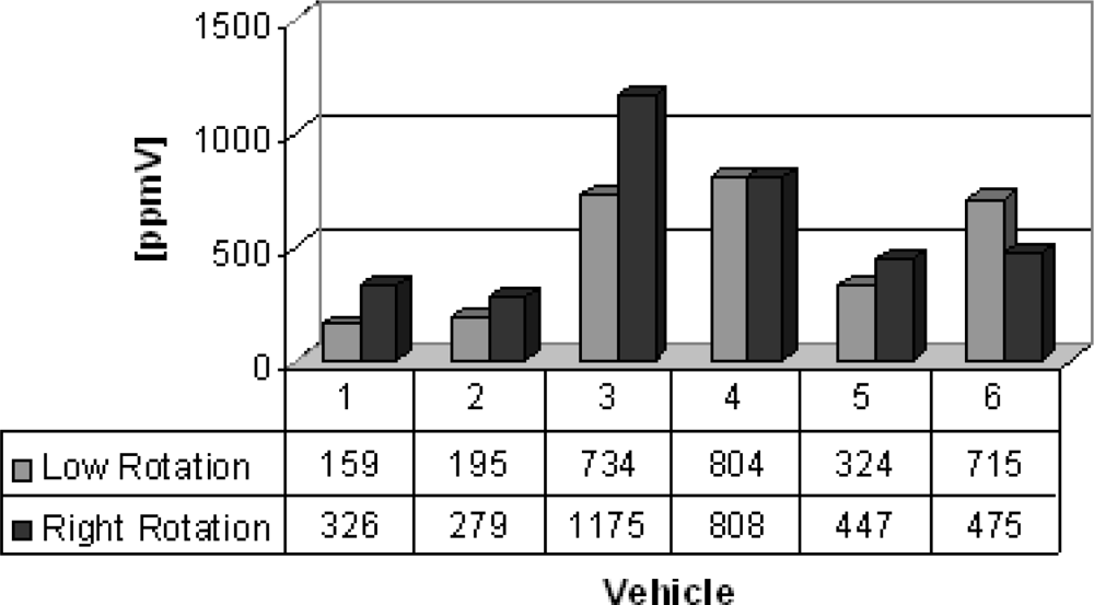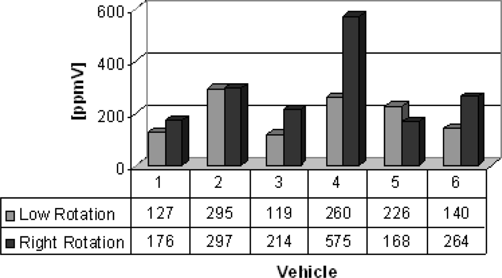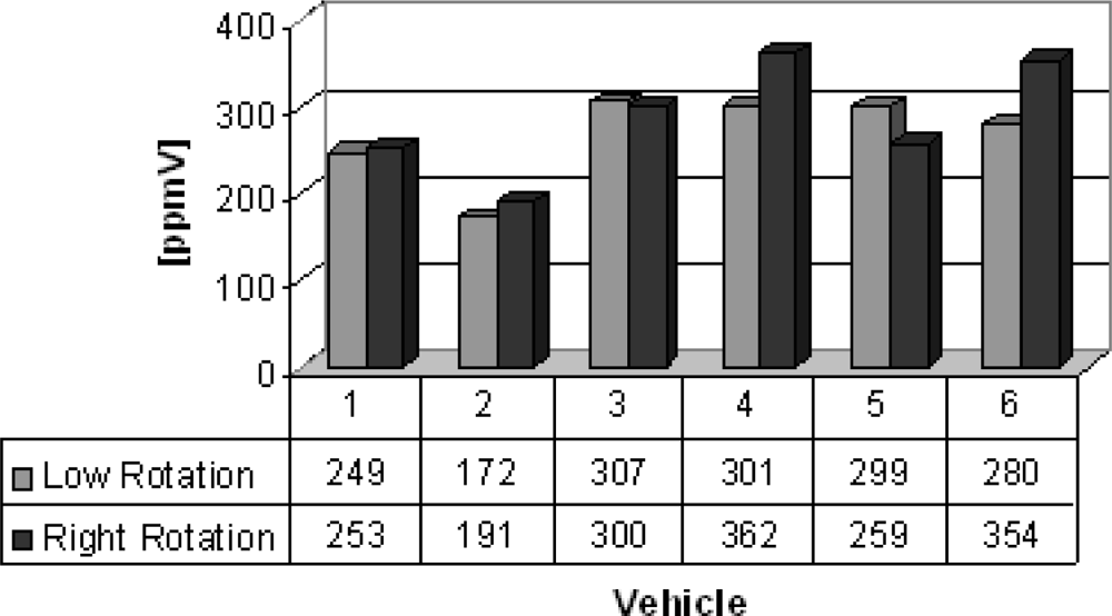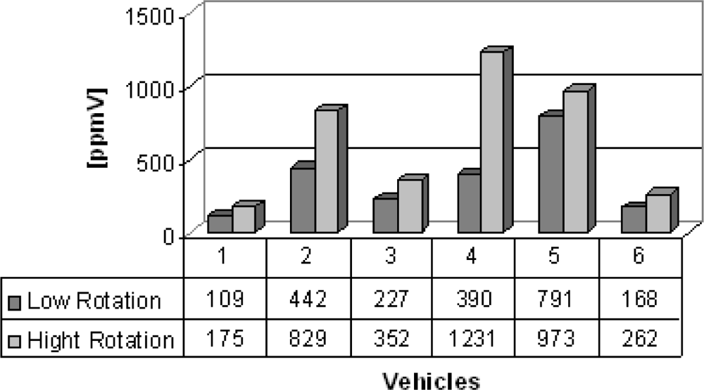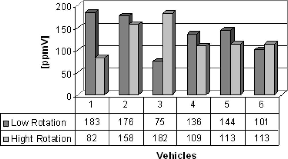 Group B are vans from which the gas samples were collected. Six vans were chosen to illustrate the feasibility of the electrochemical sensors, which succesfully detected carbon monoxide, nitrogen oxide and sulfur dioxide detection and the results are shown in figures 5–7. Carbon monoxide concentrations from 109 to 1,231 ppmV, nitrogen oxides concentrations from 75 to 183 ppmV and sulfur dioxide concentrations from 3 to 83 ppmV were detected in the exhaust in the both engine operation modes. Figure 6, concerning the issue of nitrogen oxides NOx, shows that this species behaves anomalously as it is coming from the interaction of nitrogen and oxygen from the air during the burning of fuel in the combustion chamber, thus depending on the temperature of combustion. Thus, the operation mode of the engine (high or low speed) becomes an important factor in emissions of NOx. Possibly these results were generated by the difficulty of controlling an experiment to be performed in real time and in situ, because it represents the dynamics of the transport of a city, because some collections were made in already overheated engines and others in cold engines.