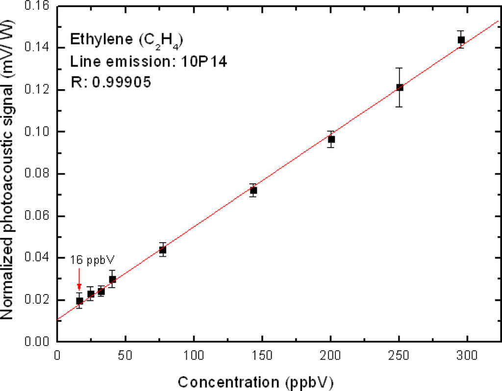 The calibration and sensitivity measurements of our photoacoustic cell were performed by obtaining the cell coupling constant C in the Equation (1). This was performed by taking a 1.1 ppmV certified mixture of ethylene in N2 and diluting it in nitrogen until the least concentration achieved (about 16 ppbV), as shown in Figure 3. Thus, a calibration curve relating the normalized PA signal (SN = S/P) and the ethylene concentration could also be obtained. As this function has a linear behavior is possible extend this linearity to ppmV levels. This calibration line follows the expression: