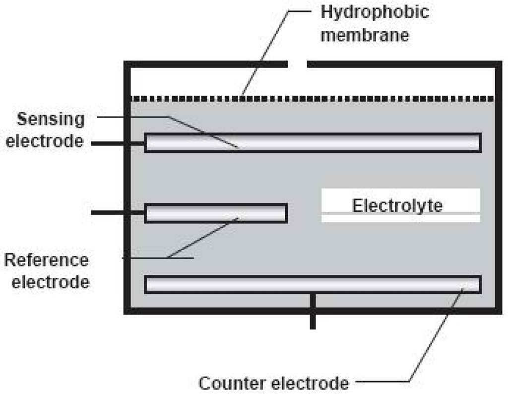 Electrochemical sensors are important tools for the detection of gaseous species due to their portability, easy automation and low cost. They also enable performing measurements in situ and in real time. The electrochemical sensors (Figure 4) wethis work are composed of a sensing electrode, a counter electrode, a reference electrode and a reagent electrolyte inserted between the electrodes. Furthermore, a barrier permeable to gas, also known as hydrophobic membrane, must cover the sensor to avoid the entry of undesirable gases and water and to control the amount of gaseous molecules that reach the electrode surface. The choice of material of the electrode depends on the type of gas to be detected and usually noble metals like gold and platinum are used. The function of the electrolyte is to facilitate the reaction and the effective ionic charge transport through the electrodes, beside providing an element of selectivity because it does not interact with other molecules.