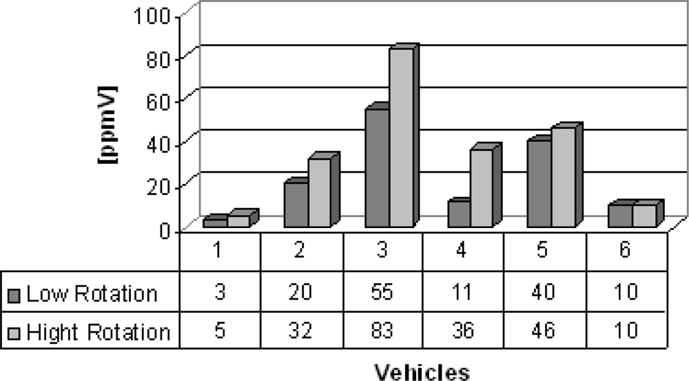 As this function has a linear behavior is possible to extend this linearity to ppmV levels. Therefore, PA spectroscopy revealed itself as a very precise and sensitive technique, since it was able to detect and monitor ethylene in our samples. Table 1 lists all vehicles from where the gas samples were collected for ethylene detection. In group A (buses), six buses were chosen to illustrate the feasibility of the photoacoustic technique to detect ethylene concentrations, obtained in the range from 3 ppmV to 45 ppmV for high and low operation regimes (Figure 4). The important feature demonstrated in this figure is that, as it would be expected, the older the bus the larger is its ethylene concentration emission, mainly in the higher rotation speed of the engine (1,000–3,000 rpm). Buses 2 and 5, the newest ones, emitted less ethylene than the other buses.