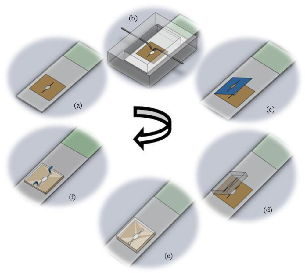 The fabrication protocol has been summarized in Figure 1. The figure details the protocol for splashing metaphase spreads on the glass slide using the splashing device followed by the rapid fabrication of the microFISH device to perform the metaphase FISH analysis protocol. The details of the fabrication protocol will be explained in the following subsections.