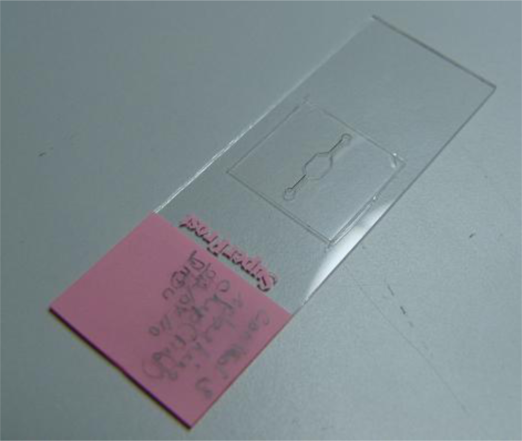 In order to account for that, we devised a novel splashing device with open chamber, which allows for easy evaporation of the fixative. The device provides 11 mm dropping height with two inlets—one for cold water and one for the fixed mitotic cells suspension. Apart from the splashing device, a novel metaphase FISH protocol was developed using a microFISH device. This microFISH device provides the possibility of replacing the traditional Coupling Jar and turning it into a miniaturized microfluidic device. We have looked into possible replacements of glass slides with various common polymers but found them unfavorable for FISH protocol on mainly three counts. Firstly, the spreading of the metaphase chromosomes on the glass slides is highly aided by the surface properties of the glass like contact angle and free surface energy. Secondly, polymers exhibit auto-fluorescent behaviour which hinders the analysis due to interference with the FISH probe signals. Finally, some polymers like PMMA couldn’t withstand the fixative used for fixing the metaphase chromosomes and cracked on contact. Hence, we found it ideal to continue using the traditional microscope glass slides as substrate which also offers the benefits of easy integration into existing workplace protocols in cytogenetic labs. In order to minimize the time of fabrication of the microFISH device, an easy protocol for rapid bonding based assembly has been developed. With this the glass slide can be turned into a microFISH device in a matter of seconds by using an adhesive tape-based stencil and bonding technique (described later in Fabrication section). The ease of operation and handling in this protocol has been targeted to allow non-technical personnel to easily conduct these tests. The rapid fabrication protocol leaves room for conducting multiple tests simultaneously. In addition, the novel protocol allows for an over 20-fold reduction in reagent volume, which is significant considering the costs of commercially available probes. We hope that this first demonstration of metaphase FISH on a chip, will spur renewed efforts in automating metaphase FISH on a chip leading to wider access to low cost, reliable and fast genetic diagnostics in clinical environments. Although the presented device has been developed for metaphase FISH, we feel that the protocol could also be applied for Interphase FISH.