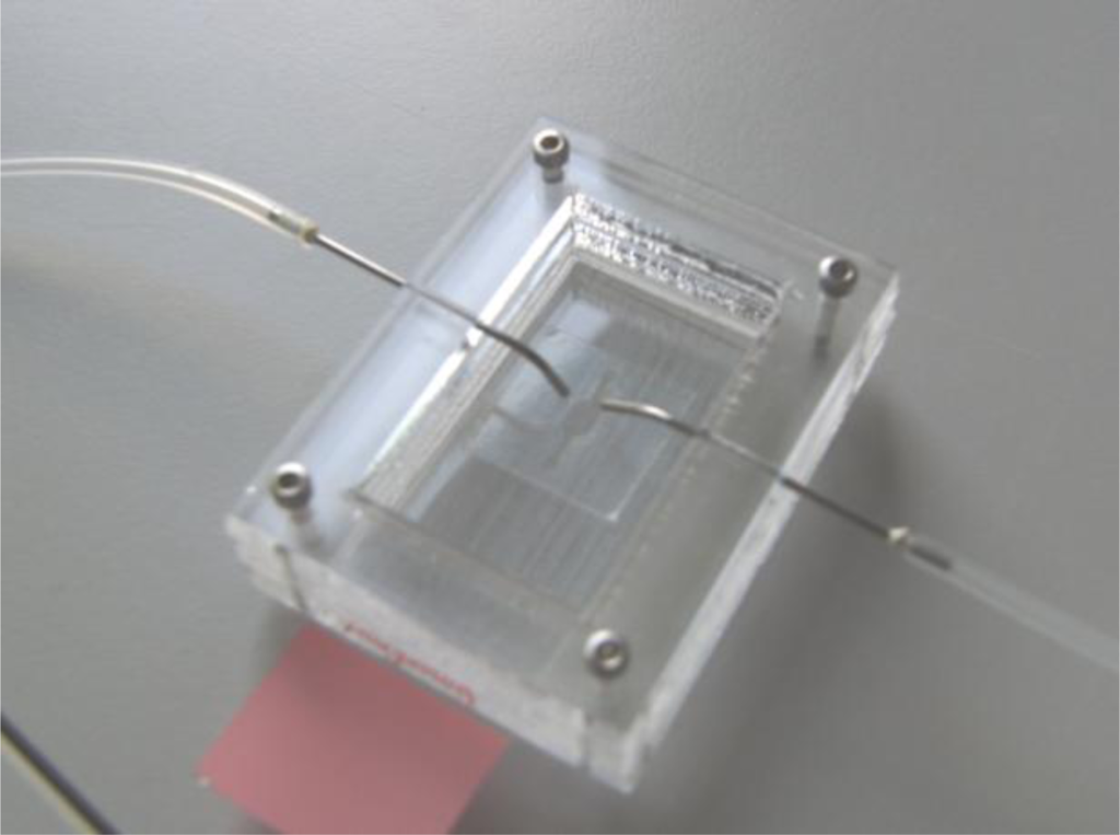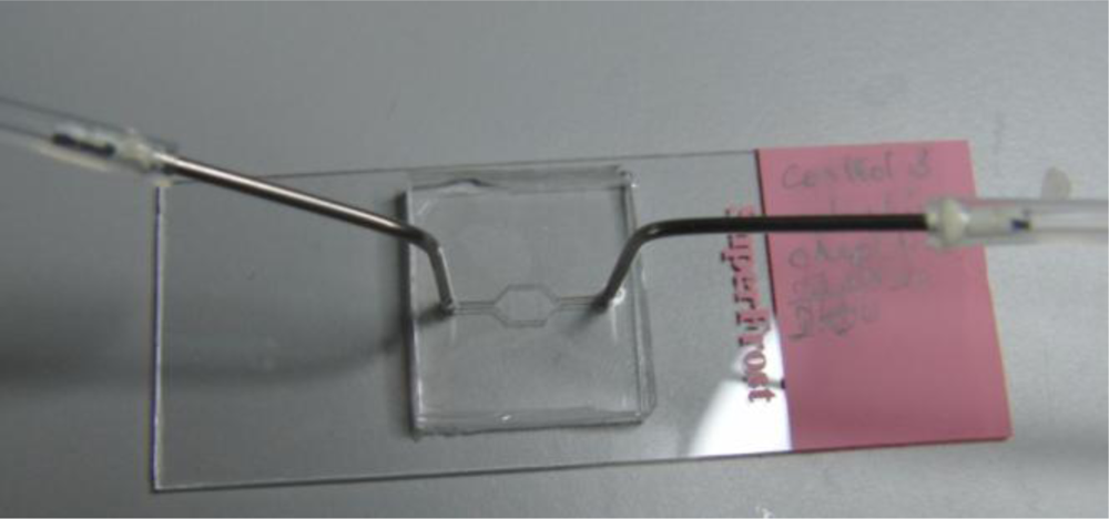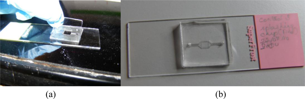 The splashing device is fabricated in two PMMA layers by a micro-milling process. The bottom part contains the sliding chamber for glass slide insertion and the top lid contains the open chamber for evaporation of the fixative. It also contains the two inlet ports for fixed chromosomes and cold water (Figure 3). The syringes are slightly bent towards the end to focus the water and chromosome suspension on to the centre of the stencil which exposes the glass slide. The two PMMA layers are either bonded together using thermal bonding [42] or screwed together as shown in Figure 3.
