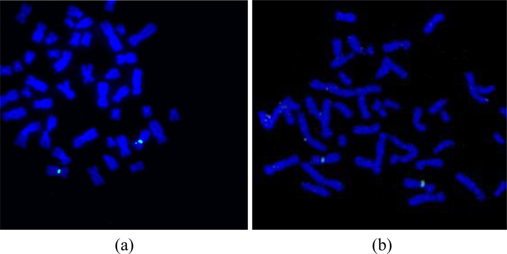 DAPI was applied to the hybridized targets on the test slides in microFISH chamber and in case of control samples, slides were mounted with cover slips. The Zeiss AxioObserver Z1 fluorescent microscope was used to view and analyze the samples for counting the metaphase spreads and the FISH hybridization signals. The chromosomes spreads on the control and test slides were counted manually using the traditional method.
