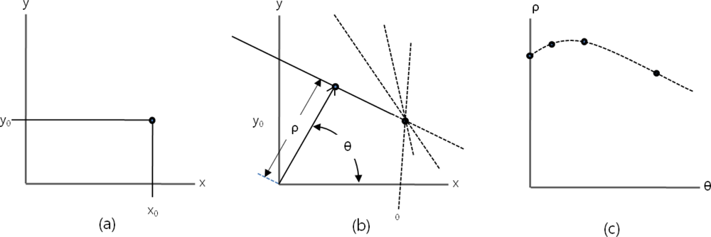 A point (x0, y0) on the image coordinate system, as shown in Figure 1(a), becomes a point in Figure 1(b) where many straight lines expressed as (ρ, θ) on the polar coordinate system intersect and it can be expressed as a line in Figure 1(c) on the (ρ, θ) plane as follows.