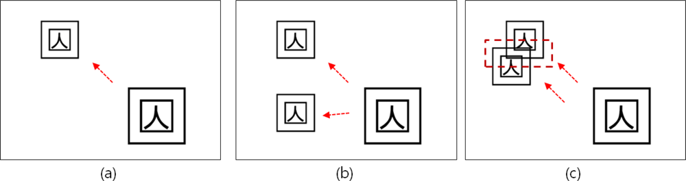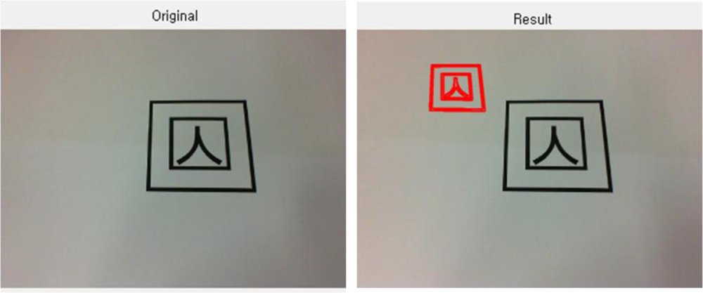 This paper is based on the assumption that an 8-bit input image is processed in binary image data, non-zero pixels are all treated as the same and N*1 matrix is stored in memory storage for the pointer of a space where copied markers will be stored. Figure 6(a) shows the process of detecting the marker using PPHT and copying one marker. Two markers are copied through multi markers copying as shown in Figure 6(b). In this way, n markers can be copied and therefore objects can be augmented, but if markers are overlapped as in Figure 6(c), the object cannot be augmented.