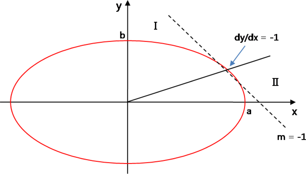 Therefore, x should be an independent variable to this point and y should be one for the remaining part. Other quadrants are drawn using its symmetry properties. If the point is (x, y), the next point possible is (x + 1, y) or (x + 1, y−1), and it is determined by seeing whether the middle point of these points is fallen inside or outside of the ellipse.