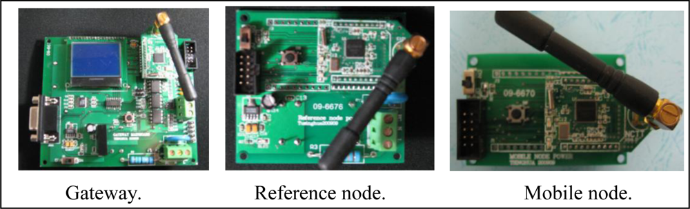 The configure parameters are chosen as shown in Table 9, where the empirical parameter A, can be determined by measuring the RSSI value one meter from the transmitting unit. The operation mode is set to 0, which denotes the mobile node only sends responses to requests; if it is set to 1, it automatically sends REFNODE responses according to the Cycle time (in seconds). The collection time is the time used on waiting for reference node response, which is in 100 millisecond increments. Min. Ref. Nodes is the minimum number of reference nodes that are needed for local positioning algorithm. We chose these parameters according to Table 9.
