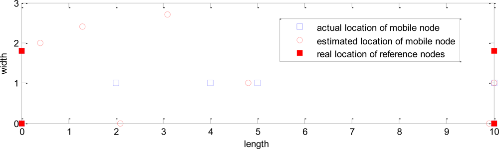 As shown in Figure 12(a), a static positioning experiment was carried out in an underground tunnel. The experimental system consists of a positioning unit (i.e., a gateway, four reference nodes and a mobile node), and an upper computer (i.e., a notebook PC: Windows 7 operating system, Intel Core 2 Duo 1.8 GHz processor, 2 GB memory, 320 GB hard disk). The positioning unit was installed in the tunnel, and is connected to the upper computer through RS232 cable. Figure 12(b) is a reference node in operation. We deploy the measurement nodes as shown in Figure 12(c).