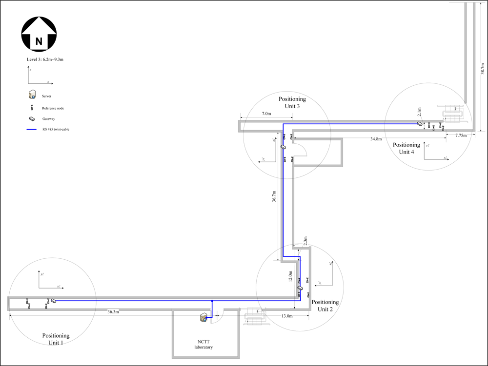 In order to verify the overall performance of MPPS, we installed twelve positioning units in the corridor of the main building in Tsinghua University. Figure 14 is the deployment map of network devices in the third level (3rd floor). The upper computer (i.e., the server) was located in NCTT laboratory, and each monitoring area (circle as shown in Figure 14) was placed a gateway and four reference nodes. The gateways and server were connected via RS-485 twist-cables, the reference nodes and the gateway were wirelessly connected according to the Zigbee protocol. The reference nodes were configured as shown in Table 8. The configuration parameters of the mobile node are listed in Table 9. Positioning units in level 1, 2 were deployed as the same as level 3.