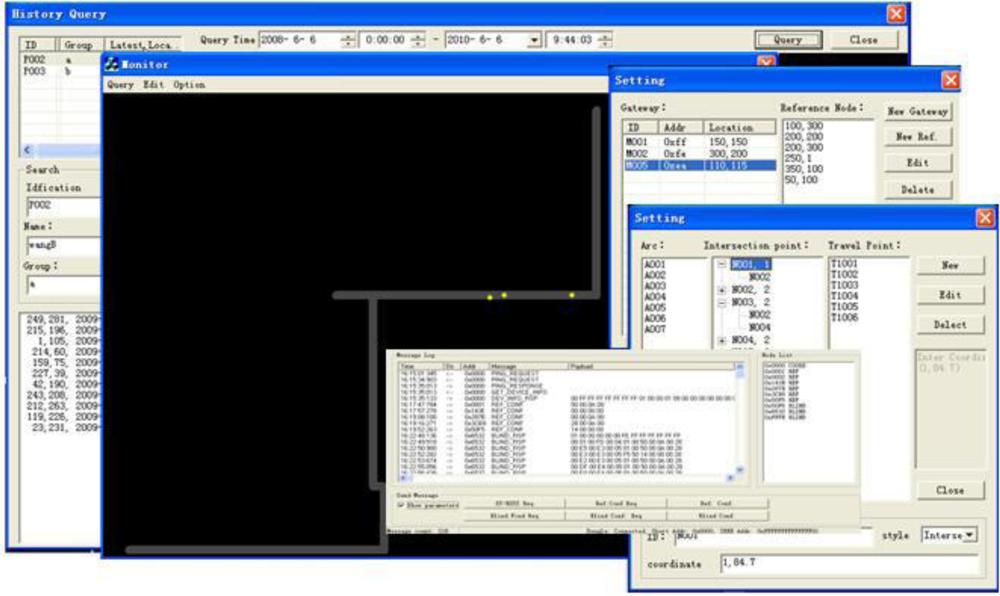 A snapshot of the tunnel network, the message log and parameter configuration on the upper computer is shown in Figure 15. The experimental results show that the hardware and software of MPPS work properly, the location information of mobile nodes was translated from the gateway to the upper computer in real-time, and periodically refreshed on the display screen (refresh rate 2 seconds). The reference nodes and mobile nodes can also be remotely configured on the upper computer; the personnel positioning information can be correctly translated among the positioning units, the upper computer and the remote client computer. The historical path of specific personnel can be shown in the form of the data tables or curves. The test error within the coverage area is approximately 3 meters. For personnel moving along the corridor with uniform walking speed, the estimation error is less than 4.5 meters according to the delay model, which meets the basic positioning requirements.