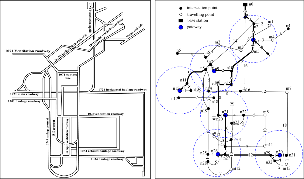 The tunnel network partition for a real coal mine [] is shown in Figure 2. To ensure that the on-site location data can be collected and processed more effectively, we divide the tunnel network into some positioning areas (denoted by dashed circles) in accordance with the distribution of the intersection and travel points. A gateway is placed in each of the local positioning area to collect and manage the mobile nodes and the reference nodes within their area, and the reference nodes are placed near the intersection points, as shown in Figure 3. The blind areas are those outside the local positioning area, where no reference nodes are placed. The wired connections between the gateways and the base station form the backbone communication network. We apply the Dijkstra algorithm and the Prim algorithm [] to optimize the topology of the backbone network for a minimum cost. The Dijkstra algorithm is used to get the shortest path tree that connect all the gateways and base stations and the Prim algorithm is used to design a minimum spanning tree on base of the shortest path tree. The optimized result is a shortest path and minimum spanning tree as shown in Figure 2 by bold black lines.