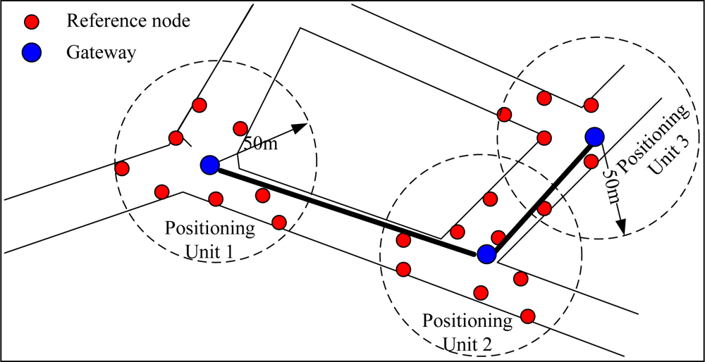 The measurement network consists of the gateways, the reference nodes and the mobile nodes according to the requirement of personnel positioning. As shown in Table 2, the data structure of the gateway includes the correlative intersection point identification (CoInterPID), and the gateway's base coordinates (BaseLoc) (i.e., the coordinates of the original point of each positioning unit) in the global reference frame.
