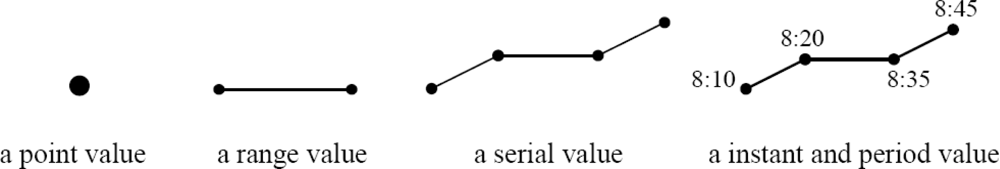 As illustrated in Figure 4, the value of type point represents the coordinate (x, y, z) of a point in the Euclidean space. The range value is the section between two points, which is represented by the two point values. The serial value is a finite set of points. The type instant represents a time instant. Time is considered to be linear and continuous, which has the form of (year, month, day, hour, minute, second). The type period is the section between two time instants, which is represented by the start instant and terminal instant.