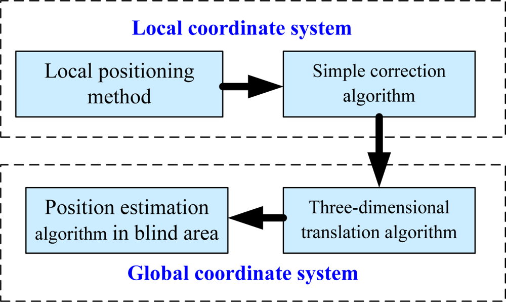 As shown in Figure 5, the global positioning method is divided into four steps: the local positioning, the simple correction, the three-dimensional translation and the position estimation in blind areas.