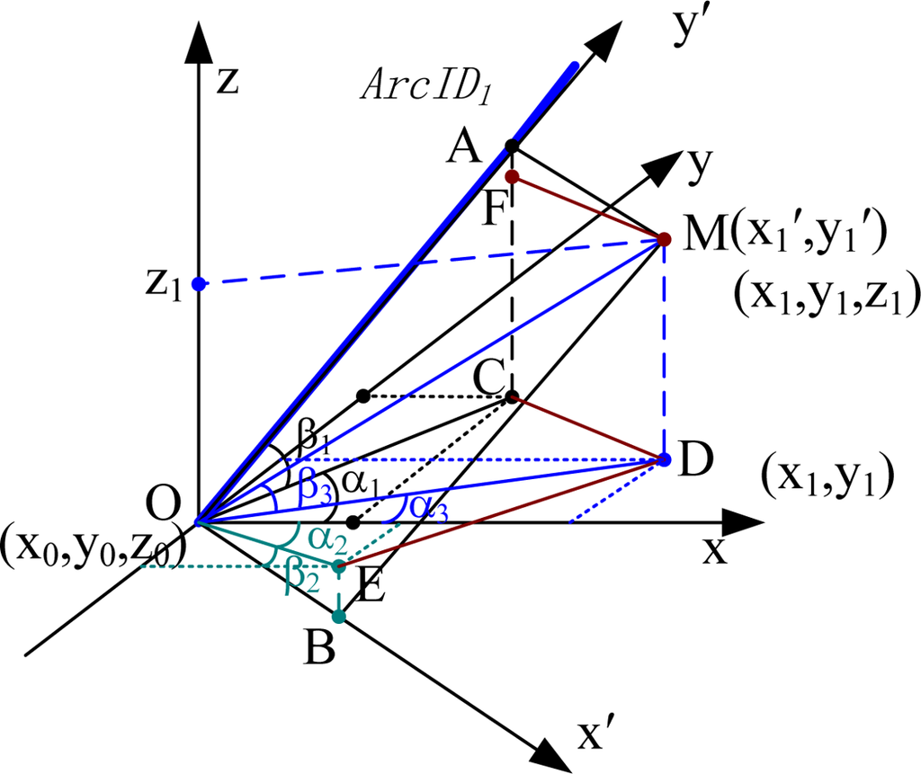 To prove this, we assume that the miner’s current position is M, whose local and global coordinates are (x1′, y1′) in the x′-y′ plane, and (x1, y1, z1) in the x-y-z global coordinate system, respectively. D is the projection of M in the x-y plane, A is the projection in the y′ axis, B is the projection in the x′ axis; C is the projection of A in the x-y plane, E is the projection of B in the x-y plane.