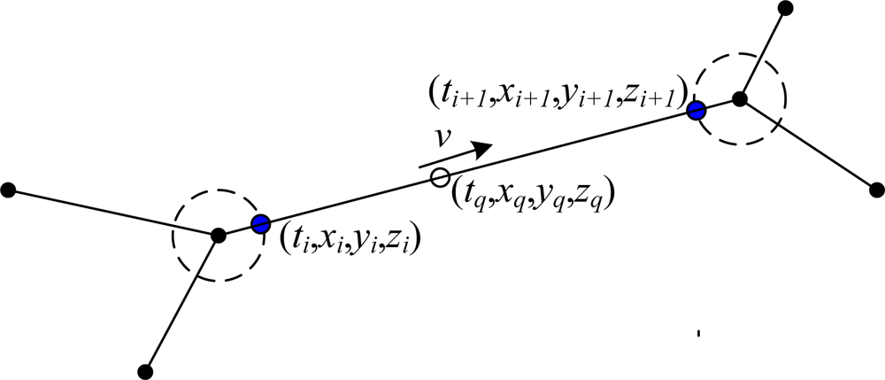 As the miner is in the tunnel network, we use the linear interpolation approach to estimate the past location. As shown in Figure 8, the dashed circle represents the monitoring area of the positioning unit, outside the dashed circle is the blind area. Assume that tq is the query instant time, ti and ti+1 are the two adjacent update time, arcid is the ArcID where the miner pid locates at time tq, xq, yq and zq are the query coordinates. Finding the arcid that the miner locates at tq. If the two updates ti and ti+1 are both located in arcid, there is only one arc between two intersection nodes, the miner is located in (tq, xq, yq, zq):
