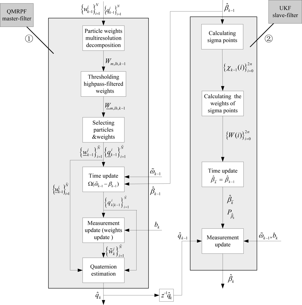 QMRPF master-filter is provided to estimate the quaternion from pairs of vector observations, and computational efficiency of quaternion particle filter (QPF) is achieved by using the spatial-domain multiresolutional approach. This section is divided into three parts: QMRPF master-filter mathematical model, the complete step sum-up of QMRPF master-filter, quaternion particle filter with multiresolution embedded.