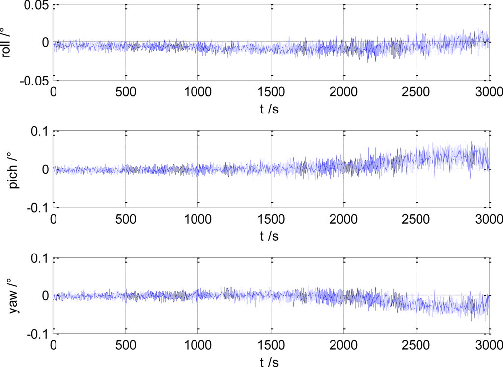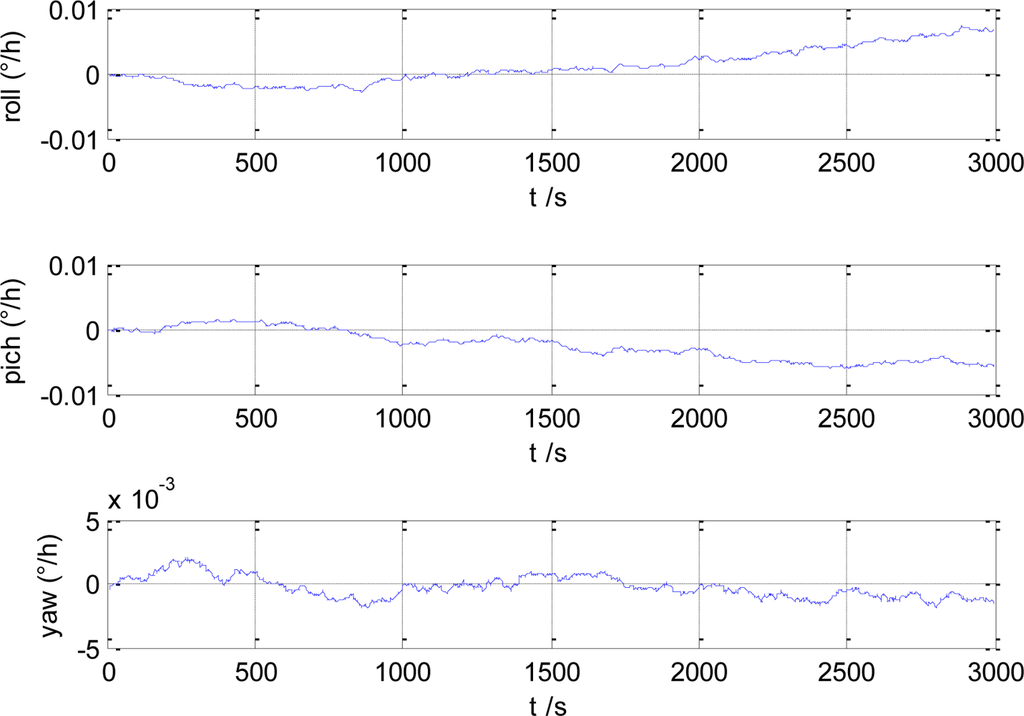 The estimation error of gyro/magnetometer integrated attitude angle estimation is shown in Figure 2. In Figure 3, the gyro bias estimation error is given. It can be seen that the attitude angle estimation error is smaller than 0.1°, and the gyro bias estimation error is smaller than 0.01°/h.