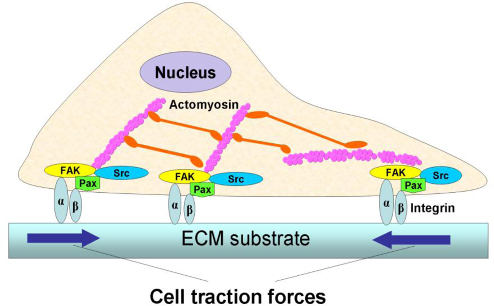 In addition, CTFs are also necessary for mechano-signal transmission and transduction. Since CTFs are transmitted to ECM through FAs, which consist of diverse proteins including signaling proteins (e.g., integrins) and enzymes (e.g., kinases and phosphatases) [13], any biological, biochemical, or biomechanical stimuli acting on cells through ECM will likely cause changes in the assembly of FA proteins, the actin cytoskeleton, and actomyosin interactions These changes will in turn affect the “output” of CTFs. On the other hand, CTFs can deform the ECM network and hence produce stresses and strains in the matrix network, which in turn can modulate cellular functions such as DNA synthesis, ECM protein secretion, and even cell differentiation [6,14]. As such, CTF may be used as a useful “biophysical marker” to characterize phenotypic changes of individual cells.