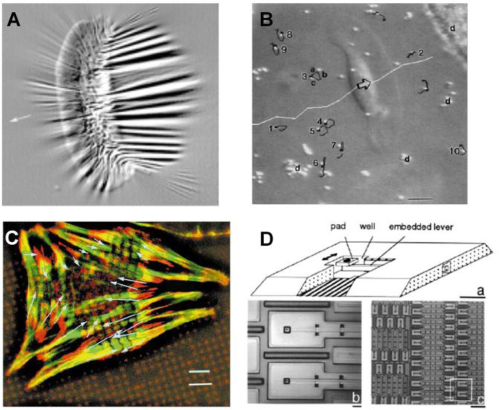 To this end, a few single cell-based techniques for sensing or measuring CTFs have been developed using optical or microelectronic approaches. All these techniques can determine CTFs of individual cells at sub-cellular level, meaning that they can “map” the CTFs of a single cell. A common feature of these techniques is that they all involve the use of deformable substrates that are compliant enough to sense the tiny forces generated by a single cell. Such substrates are either continuum sheets, including wrinkle-able thin silicone membranes [4,36,37] and fluorescent beads-embedded polyacrylamide gels [38–40], or non-continuous substrates, including microfabricated cantilever arrays [41] and micropost arrays [42–46].