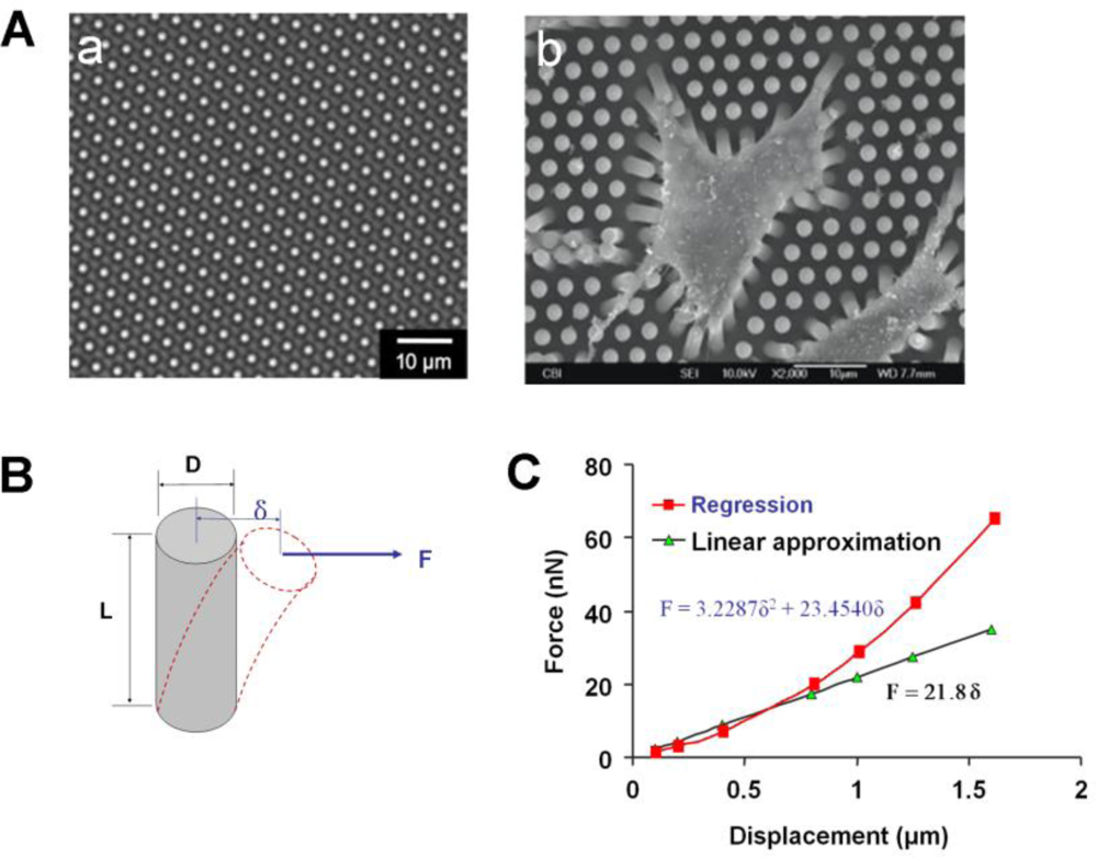 To overcome the limitations associated with cantilever arrays, CTF measurement techniques based on micropost force sensor arrays (MFSAs) have been developed in recent years [42–44,52,53]. In a MFSA, each micropost functions as an individual force-sensing unit and independently senses the CTFs locally applied by a cell. Specifically, when a cell adheres to the microposts, it exerts tensile forces at the top of microposts and causes lateral deflection in them (Figure 4A) [42]. Once the deflections of the microposts are obtained by imaging analysis, the CTFs can be determined based on the beam deflection-force relationship that has been calibrated, or be calculated according to well-established beam theory [54] (Figure 4B). However, such a linear relationship between deflection and force in the beam theory is no longer valid if the deflection exceeds a certain level, when regression approximation must be applied (Figure 4C).