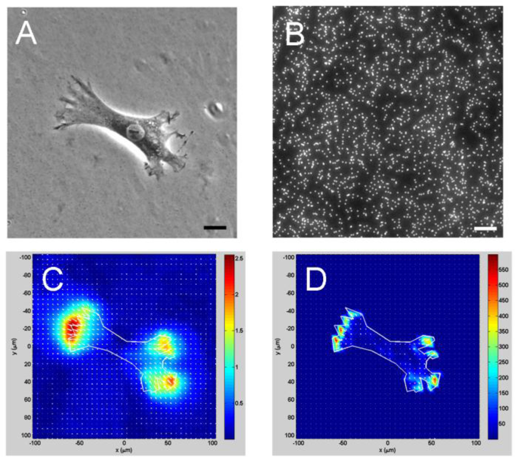 One shortcoming of the MFSA technique is that it can only measure CTFs at predetermined, discreet points. A further advancement in CTF measurement is cell traction force microscopy (CTFM), which can determine CTFs in the entire cell spreading area [7,49,57,58] (Figure 5). CTFM represents a combination of experimental and computational approaches for CTF determination. It relies both on optical tracking of fluorescent microbeads embedded in an elastic substrate to determine deformation of substrate and subsequently on elasticity theory to determine CTFs by computation. Therefore, in essence, the elastic substrate in CTFM functions as a “sensor” of substrate deformations produced by CTFs, and the elastic theory is basically used to “convert” the substrate deformations into CTFs.