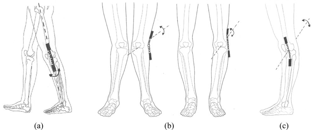 The effect of misalignment around the longitudinal axis, i.e., rotation between the endblocks of the goniometer [cf., Figure 2(a)], can be compensated for, regarding both the general and the individual crosstalk, provided that the rotation angle between the endblocks and that the individual crosstalk of the goniometer are known. Since the algorithms for these compensations refer to the mechanical reference position of the goniometer, i.e., the endblocks of the goniometer aligned in all three dimensions, the output from the goniometer in this position (the offset value) has to be recorded and subtracted from the subsequently recorded data before applying these algorithms. This procedure of referring the measurements to a reference position is often referred to as “setting the zero position”. Misalignment due to valgus/varus [cf., Figure 2(b)] and flexion/extension deviations [cf., Figure 2(c)] might be compensated for by “setting the zero position” when the subject is standing in the anatomical reference position. Of course, by definition, the compensations for the valgus/varus and flexion/extension angles are valid for the reference position of the knee. However, the position of the goniometer when it is attached to a subject’s knee deviates from its mechanical reference position, and therefore, it is obvious that the crosstalk compensations are not valid during flexion/extension movements if the mechanical reference position of the goniometer is not used for “setting the zero position”.