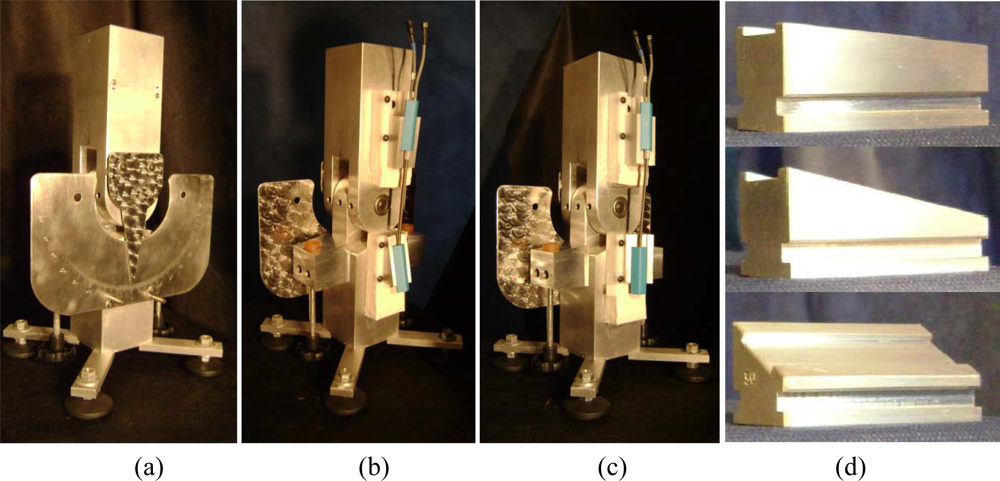 Wedges were used to simulate frontal and transverse plane misalignments. Endblock misalignments for valgus/varus were obtained by means of a pair of wedges, one at the thigh and the other at the shank, and for rotation by means of one wedge at the shank (Figure 4). Valgus endblock misalignment was defined as positive and varus as negative. Valgus misalignments of 20°, modeled as the sum of the misalignments of the endblocks on the thigh and the shank, were obtained as ten combinations (2°/18°, 4°/16°, …, 20°/0°; the first number representing the angle of the wedge on the thigh and the second one the angle of the wedge on the shank). The corresponding varus misalignments were obtained in an analogous manner.
