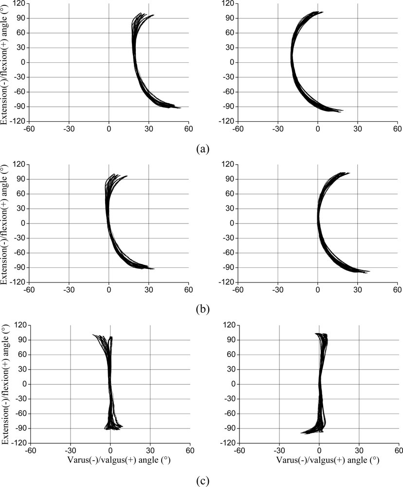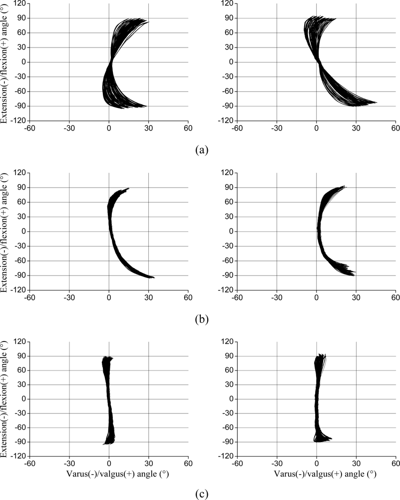 Regarding valgus/varus misalignments, in the static 0° flexion/extension position of the jig, the recorded valgus/varus offset corresponded to the summed misalignment, independent of the distribution of the misalignment between the thigh and the shank. During the ±100° of flexion/extension movements, valgus/varus misalignment caused a corresponding shift in the valgus/varus angles over the whole range of motion [Figure 5(a)]. Hence, by subtracting the offset, it was possible to correct for this error, as shown in Figure 5(b). Although the offset compensation eliminated the error for 0° of flexion/extension and reduced it to a few degrees for small (±30°) flexion/extension angles (1.1°; Table 1), the individual crosstalk caused a pronounced error for angles ranging ±100° [18.8°; Figure 5(b) and Table 1]. By also compensating for the individual crosstalk, the error was further reduced, although this effect was still visible for angles exceeding 30° [Figure 5(c)]. For angles in the range ±60°, the error was reduced by a factor of 2 to 3. Nonetheless, the X-Y graphs for the fully compensated data [Figure 5(c)] present a curved pattern, particularly at flexion/extension angles close to 100°.