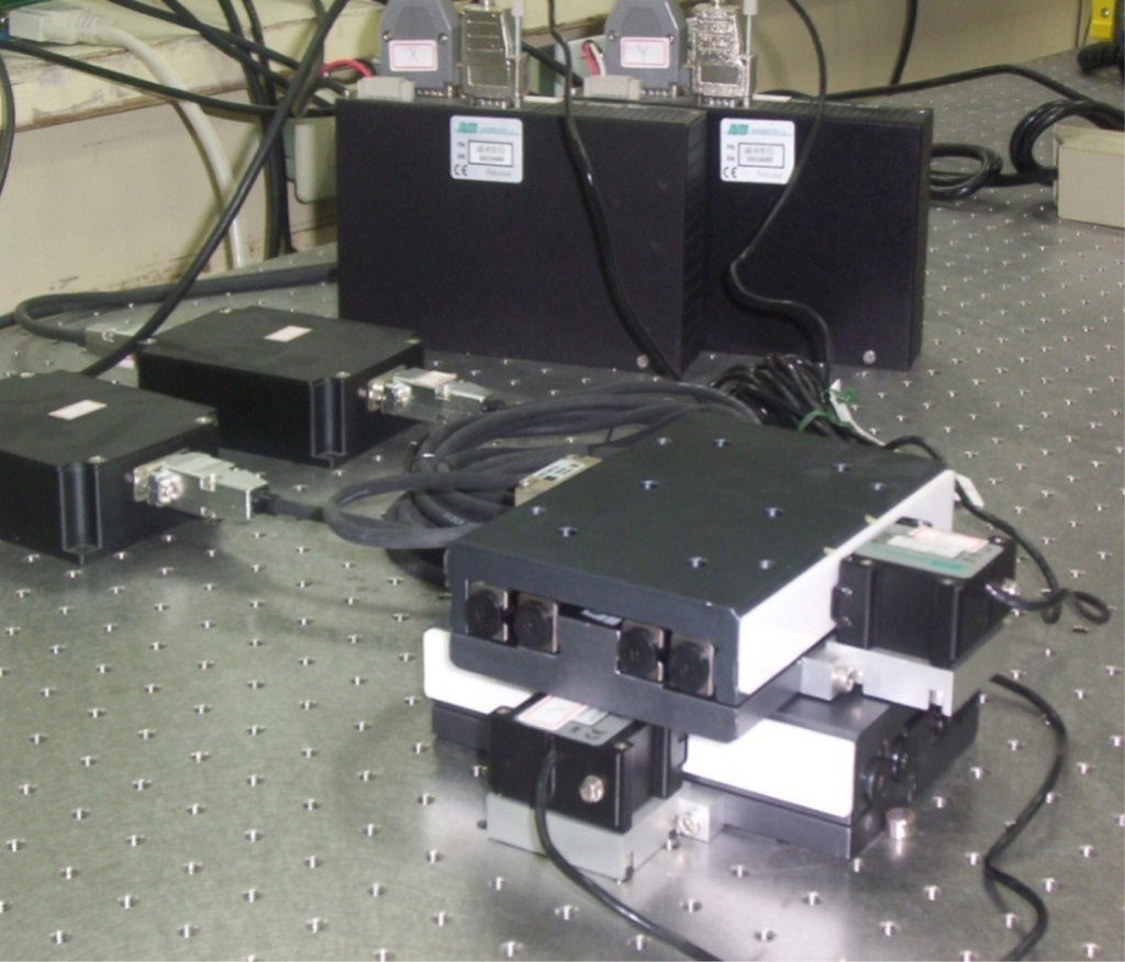 A piezoelectrically actuated X–Y table shown in Figure 1 was built for investigating the dynamic system control behavior. Two HR8 motors were used to actuate the X axis and Y axis, respectively. There is a linear response feature between the piezoelectric actuator velocity and the driver control voltage. The actuator and driver can be modeled as a DC motor with internal friction that is driven by a voltage amplifier. The driver generates a 39.6 kHz sinusoidal wave to drive the actuator with an amplitude function when a command voltage within ±10 V is sent to the driver unit. This constant oscillation frequency is generated from the driver unit which was supplied by Nanomotion Limited.