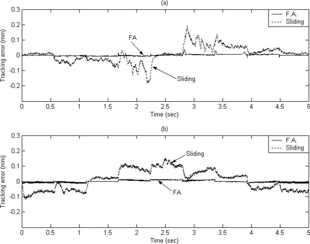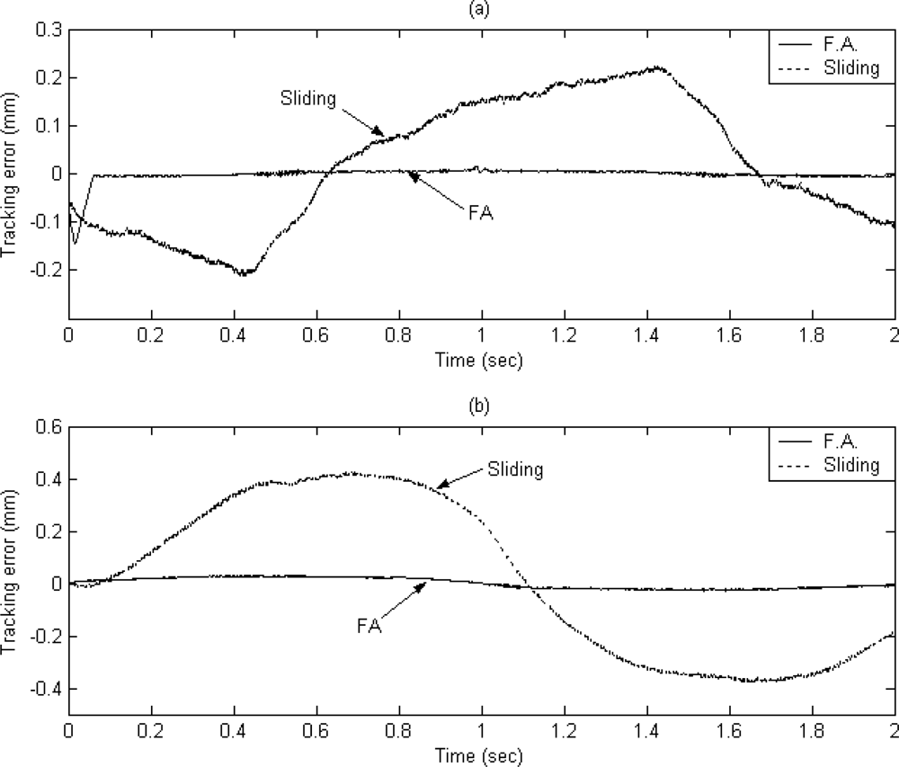 The dashed line shows the reference circular contour signal, the solid line depicts the tracking response by using the proposed FAT based adaptive sliding controller and the dotted line denotes the tracking response by using a traditional model-based sliding-mode controller. The tracking errors of the X axis and Y axis are shown in Figures 7(a) and 7(b) for comparison. The solid line exhibits the tracking error by using the proposed FAT based adaptive sliding controller and the dotted line denotes the tracking error by using a traditional model-based sliding-mode controller. It can be observed that the maximum X axis tracking errors are 0.21 mm and 0.017 mm for the model-based sliding-mode controller and the proposed FAT based adaptive sliding controller, respectively. The maximum Y axis tracking errors are 0.42 mm and 0.028 mm for the model-based sliding-mode controller and the proposed FAT based adaptive sliding controller, respectively. The root mean square (RMS) values of the tracking error for X axis are 0.1351 mm and 0.0169 mm for the model-based sliding-mode controller and the proposed FAT based adaptive sliding controller, respectively. The RMS values of the tracking error for Y axis are 0.2991 mm and 0.0202 mm for the model-based sliding-mode controller and the proposed FAT based adaptive sliding controller, respectively.