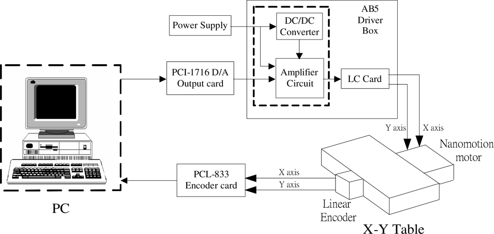 A PC-based controller was developed for experiments with this system. The X–Y table has two independent axes, X and Y, actuated by two different piezoelectric actuators. The experimental layout of this positioning system is shown in Figure 2. The control voltage is calculated on the PC, converted from a digital to an analogue signal by a D/A interface card and sent to the piezoelectric actuator driver unit to actuate the piezoelectric motor. The displacements of this X–Y table are sensing and measured by linear encoders and sent back to the PC via an encoder card for closed-loop control.