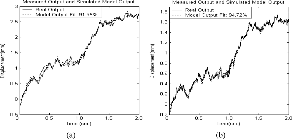 The estimation output of these two identified models and the system experimental output with PRBS input voltage excitations are plotted in Figures 3(a) and 3(b) for comparison. The solid line represents the measured system output and the dotted line depicts the simulated model response. It can be observed that the dynamic behavior of the identified model is matched well the piezoelectrically actuated system’s dynamic response. The difference between both response curves is due to the system’s nonlinear, time-varying behavior and hysterisis dynamics effects. Based on these identified models, the unknown time-varying functions can be estimated and used to evaluate the accuracy of the functional approximation scheme. In addition, a model-based sliding-mode controller can be designed based on the estimation models. Its control performance will be compared with that of the proposed FAT controller.