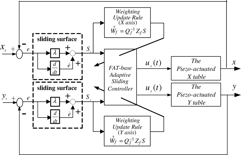 Due to the piezoelectrically actuated system has nonlinear time-varying dynamics, the functional approximation technique is employed to replace the unknown nonlinear functions for a sliding-mode control design. The system control block diagram of this piezoelectrically actuated X–Y table is shown in Figure 4. The adaptive laws of the function coefficients can be derived from Lyapunov stability theorem. The sliding surface of this second order system can be defined as: