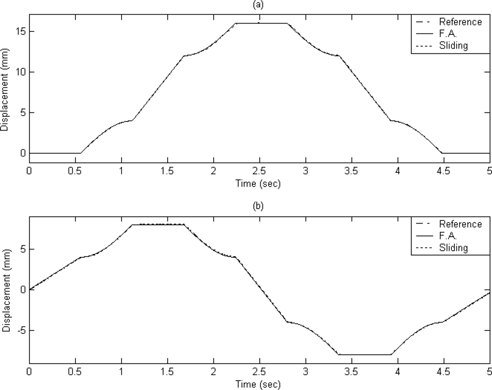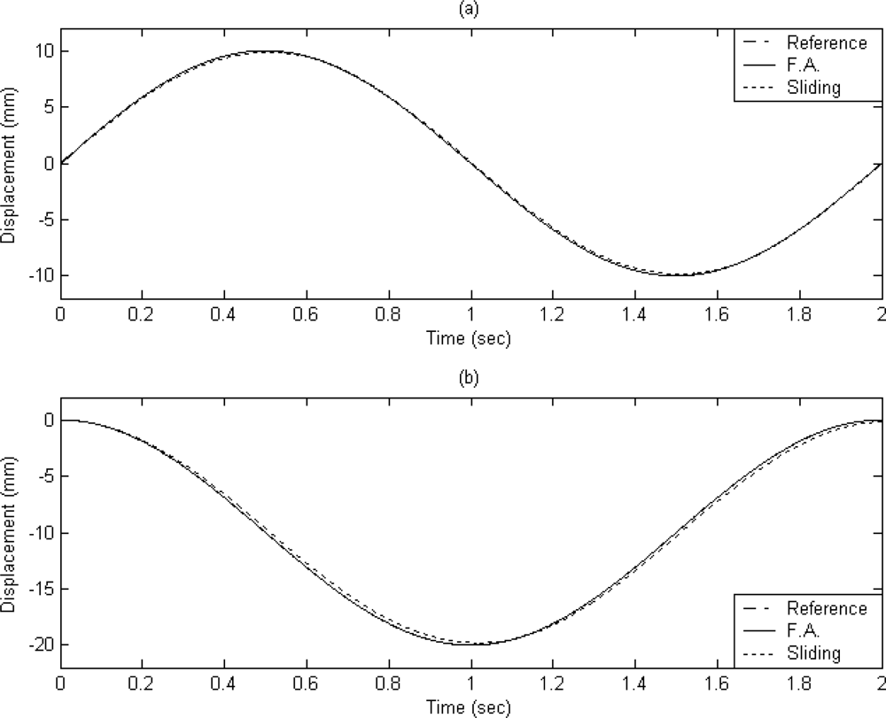 It can be observed that a good tracking response can be obtained for the X–Y table for the reference circular contour by using the proposed FAT based adaptive sliding controller. The displacements of X axis and Y axis are plotted in Figures 6(a) and 6(b), respectively.