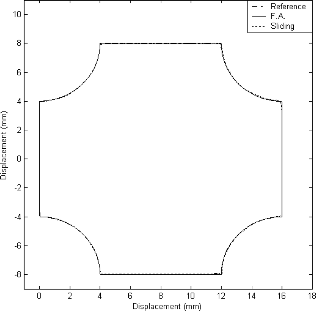 In this case, a window contour, shown in Figure 8, was designed for the two-dimensional motion control. This window contour can be generated by the accumulation of the angles as a function of time for the X axis and Y axis. The experimental result on the tracking response of the X–Y table is shown in Figure 8. It can be observed that a good tracking response can be obtained for the reference window contour by using the proposed FAT based adaptive sliding controller.