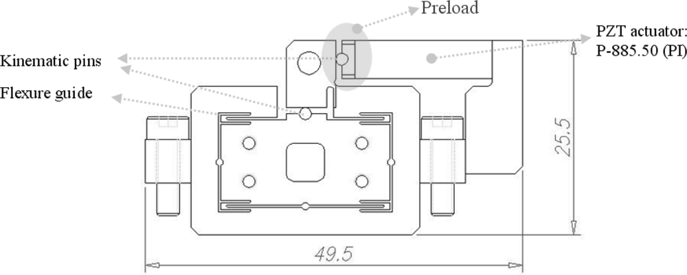 A z-scanner serves as a vertical fine scanner for the nulling control of an optical lever. A diagram of the z-scanner is shown in Figure 1. The flexure guide is used as a guide mechanism. A PZT actuator is attached to the flexure guide via a kinematic pin. Because the PZT actuator is fragile with respect to tension and moment loading, it cannot be glued into the guide. As a solution, an appropriate preload is applied to the flexure guide during assembly to prevent detachment between the actuator and the guide. Accordingly, the preloading effect should be considered in the optimal design. The critical design point of the scanner is as follows. Because the working distance and the viewing angle of the objective lens are fixed, the height and the overall dimension of the z-scanner should be minimized for viewing the cantilever. In this study, so as not to interfere with the viewing angle of the objective lens, the PZT actuator’s horizontal deformations are transferred to the vertical flexure guide via the circular hinge and the two kinematic pins. Moreover, the resonant frequency should be high enough for fast nulling control.