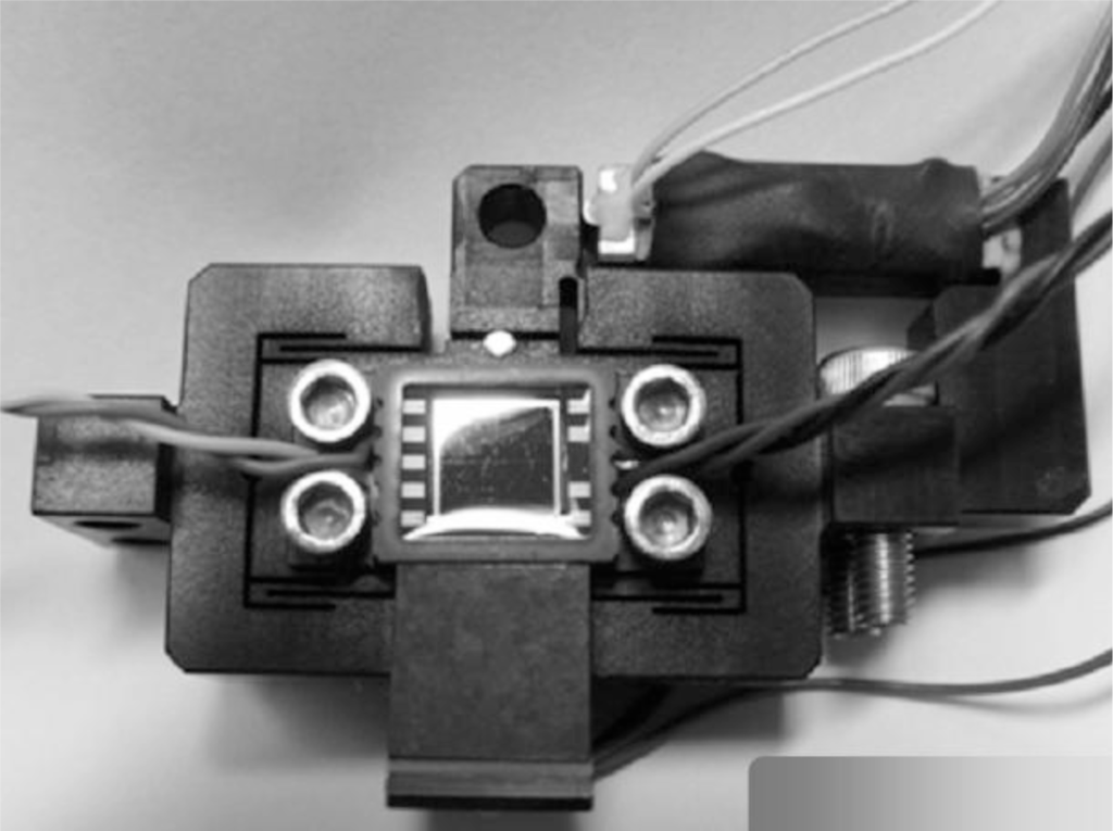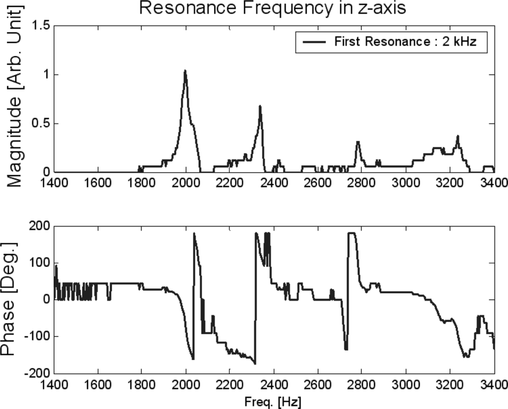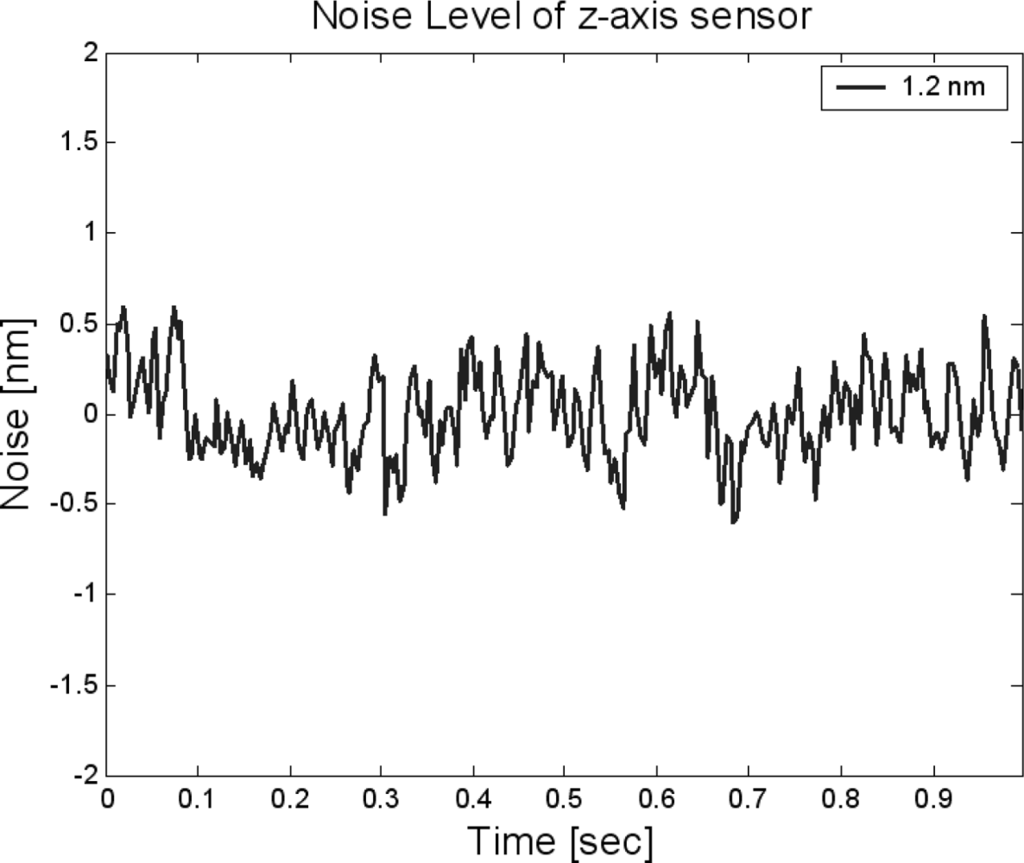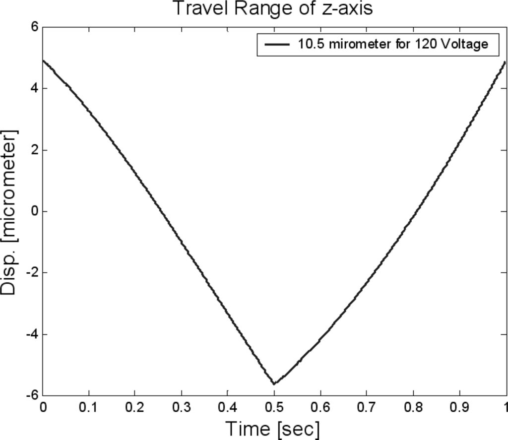 The assembled z-scanner is shown in Figure 7. The travel range of the z-scanner is shown in Figure 8. Here, the range is about 10.5 μm. The input voltage is about 120 V for protection of the PZT actuator. If an input voltage of 140 V (which is the maximum input voltage for the PZT actuator) is given, the travel range would increase to 13 μm which is close to the final goal of the design. The resolution was measured as shown in Figure 9. The noise is about 1.2 nm peak-to-peak. Also, the resonance was measured as shown in Figure 10. The first resonance is about 2 kHz, which is close to the optimal design result.