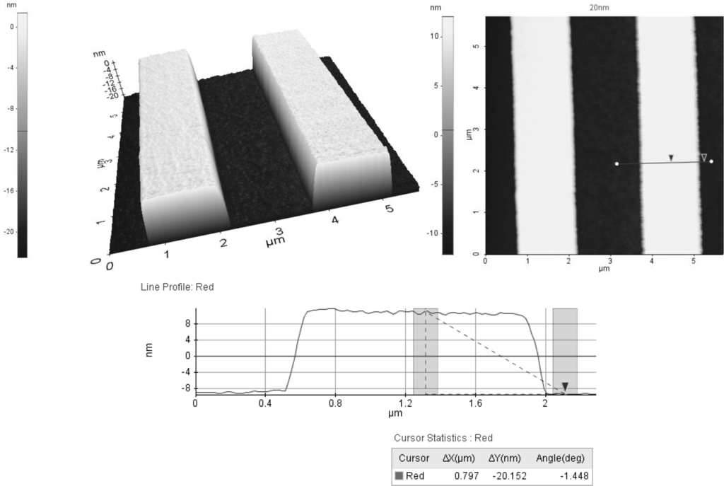 The step height (20 nm) standard sample was measured using our homemade AFM with the proposed vertical scanner as shown in Figure 12. The step height sample is clearly shown in the figure, and the vertical scanner was shown to be useful and applicable to the AFM.